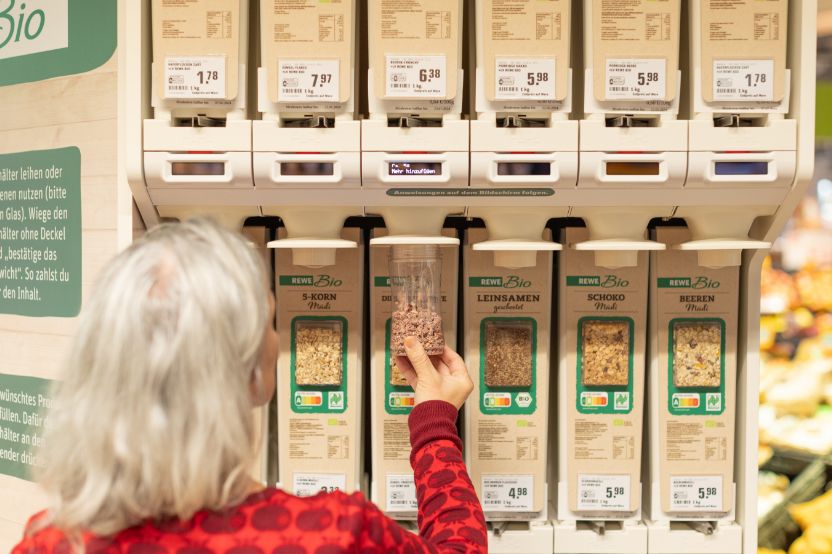 Wir testen verpackungsfreie Optionen: 2023 und 2024 etwa bei REWE in Deutschland in einem Pilotprojekt zu Unverpackt-Stationen für Trockensortimente wie z. B. Reis und Cerealien von REWE Bio. BILLA in Österreich testet seit 2022 ebenfalls Unverpackt-Stationen mit über 100 unverpackten Bio-Produkten in aktuell zwei Märkten.
